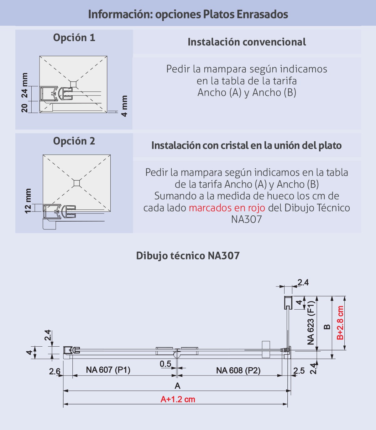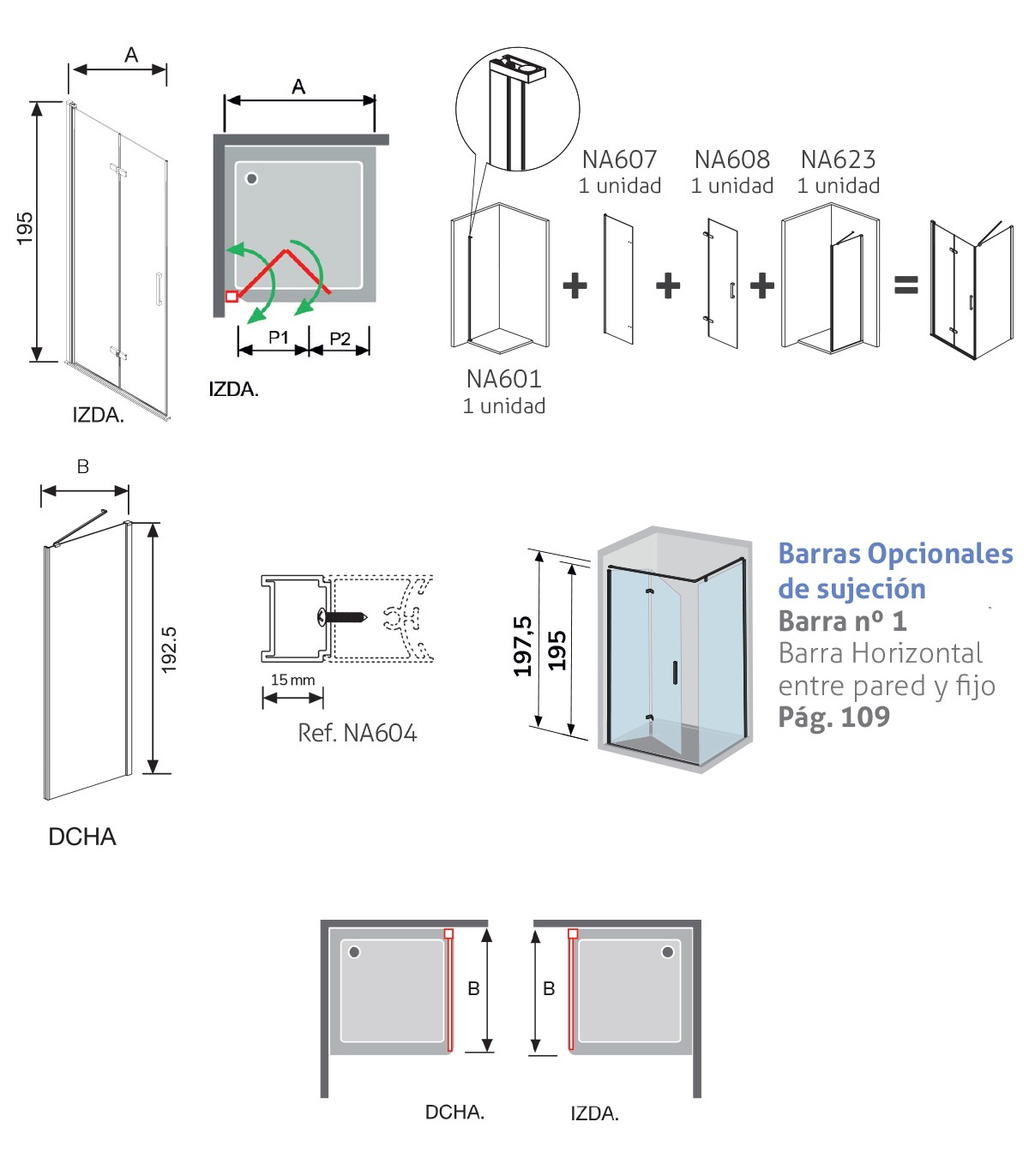| Ref. NA307 05 (negro) 16 (plata alto brillo) 36 (oro cepillado) | Ancho (A) | Apertura (C) | PVP | Ref. | Puerta 1 (NA607) | Puerta 2 (NA608) | Puerta (P1) | Puerta (P2) |